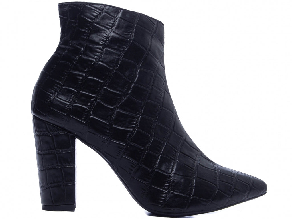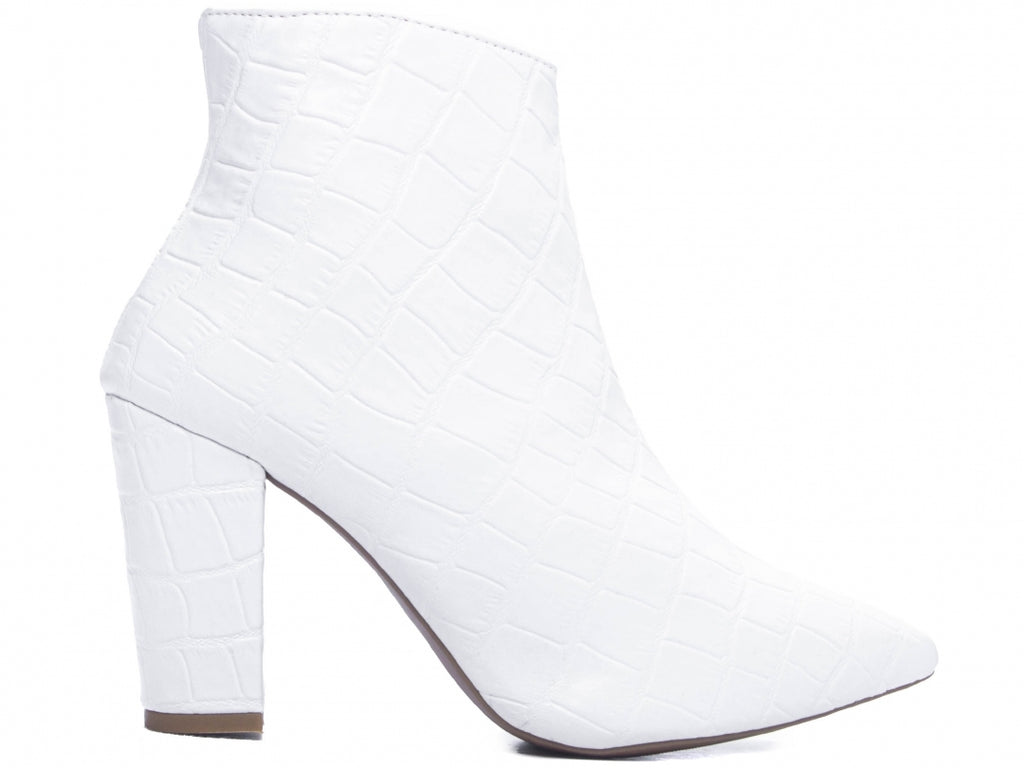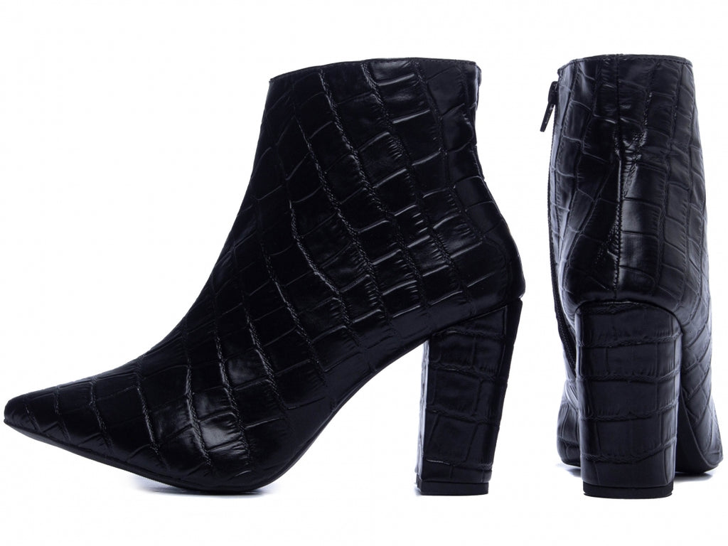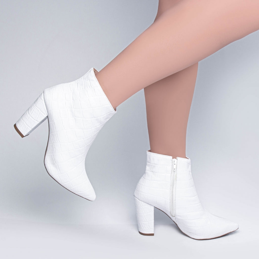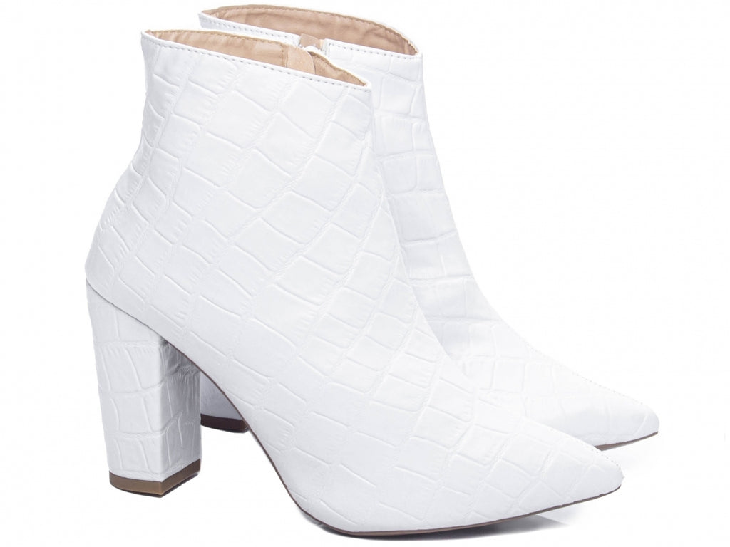 Material: Napa Croco;Enfeites: Zíper;Palmilha: 8 mm de Espessura, Espuma em EVA, e Taloneira Napa;Forro: Cacharrel, material espumado para maior conforto;Salto: 8,5 cm de Altura encapado em Napa Croco;Solado de PVC na cor Bege.