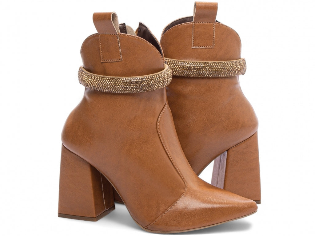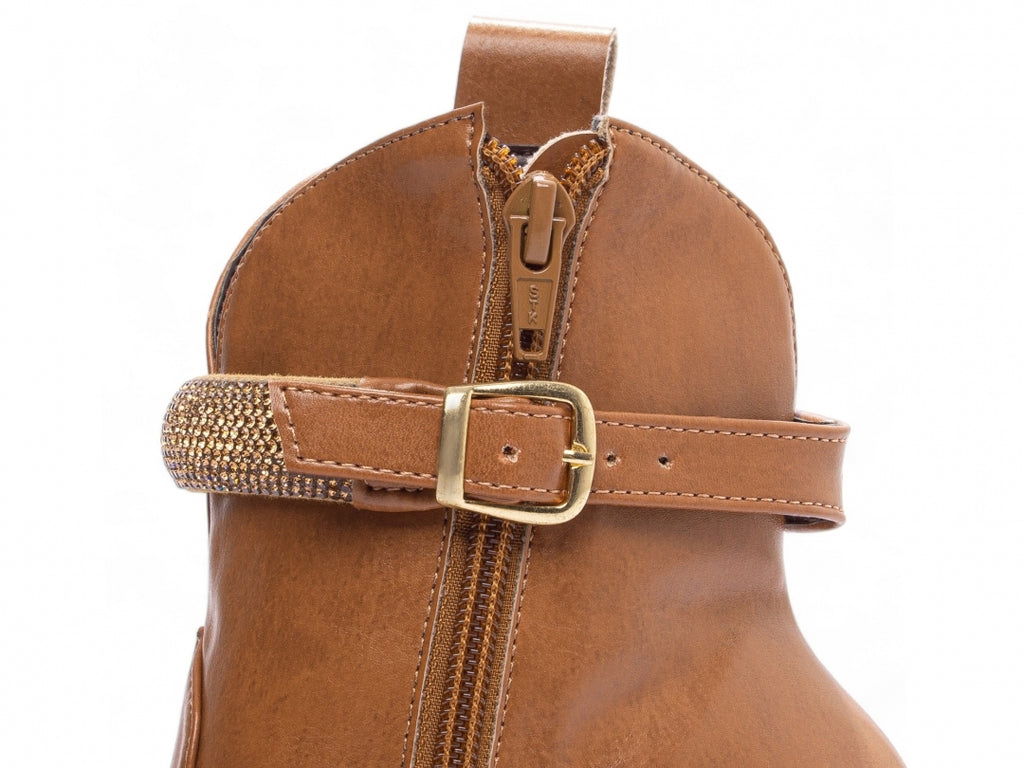 Enfeites: Zíper na Cor Caramelo (lateral interna) e Pulseira Removível com Fivela de Ajuste na cor Dourado e Manta de Strass;
