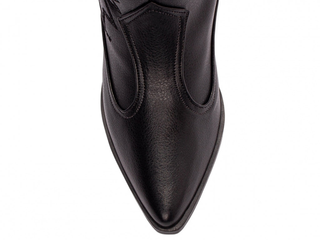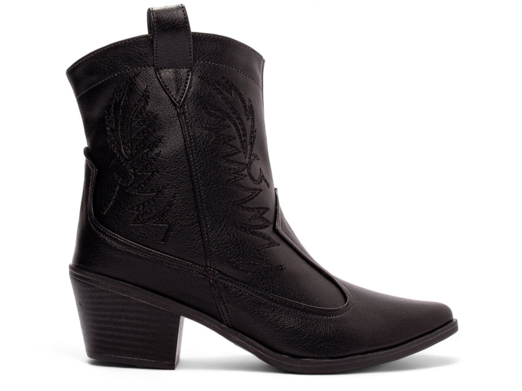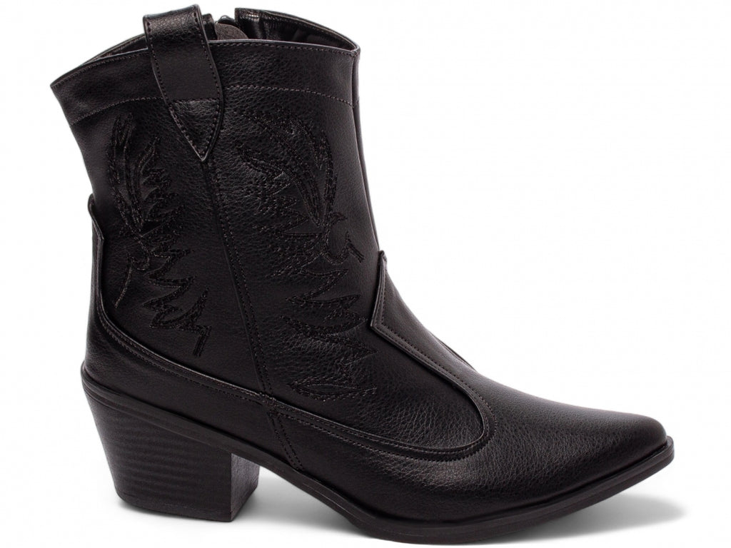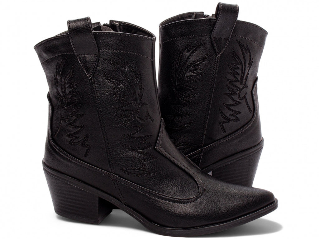 Material: Napa Preto com Bordados;Enfeites: Zíper (lateral interna);Palmilha: 8 mm de Espessura, Espuma em EVA, e Taloneira em Napa;Forro: Cacharrel, material espumado para maior conforto;Salto: 6 cm de Altura;Solado em Micro.
