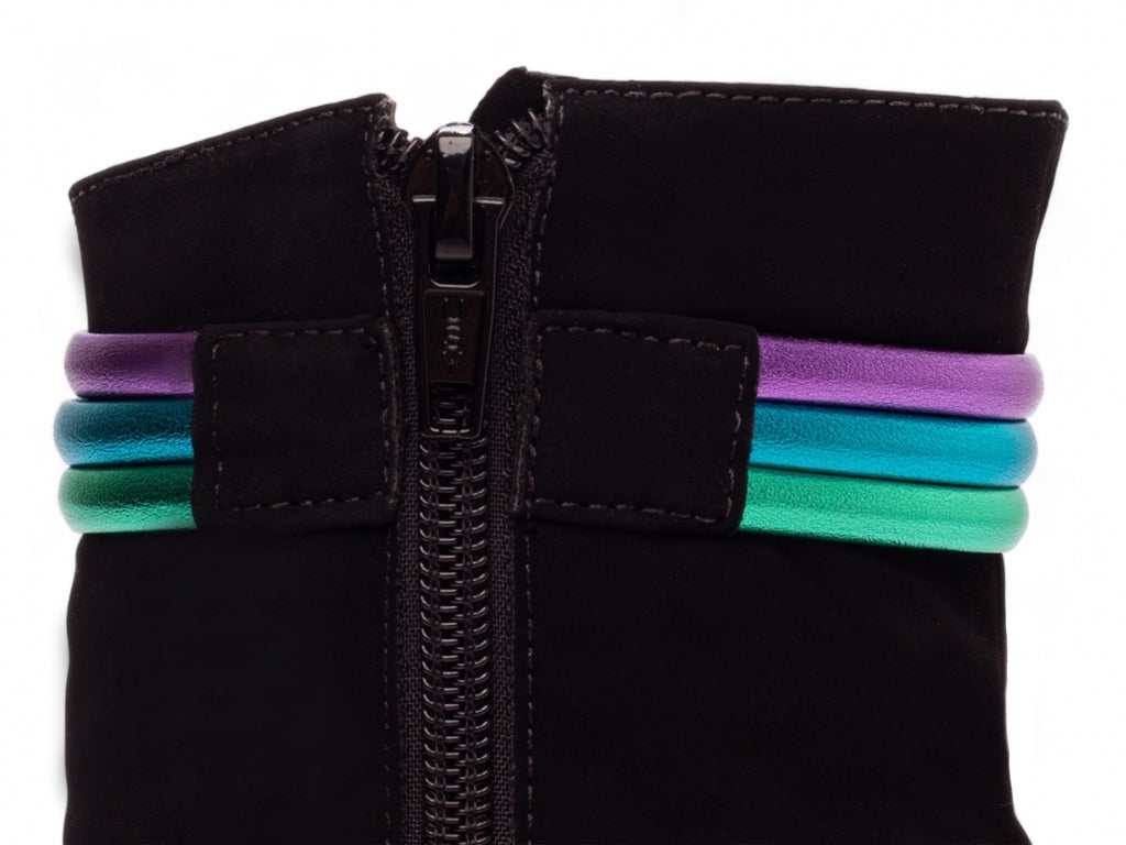 Enfeites: Zíper na Cor Preto (lateral interna) e tiras multicolorido;