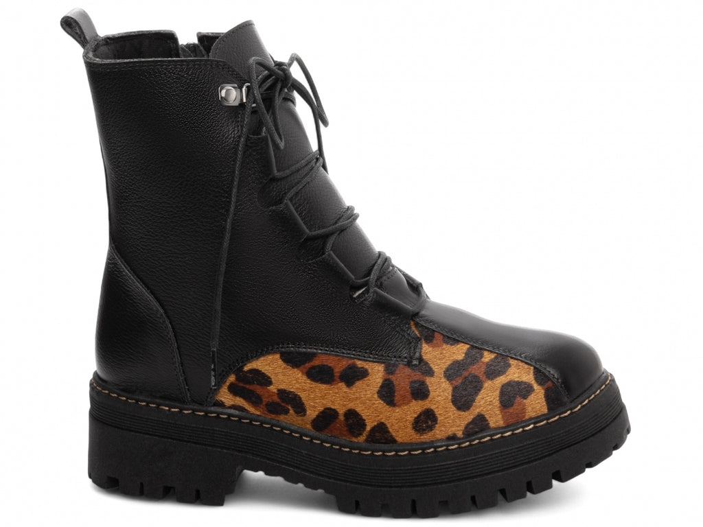 Material: Couro Preto e Pelo na cor Onça;Enfeites: Cadarço na Cor Preto;Palmilha: 8 mm de Espessura, Espuma em EVA, e Taloneira Preto;Forro: Cacharrel, material espumado para maior conforto, na cor Preto;Solado Tratorado Preto.