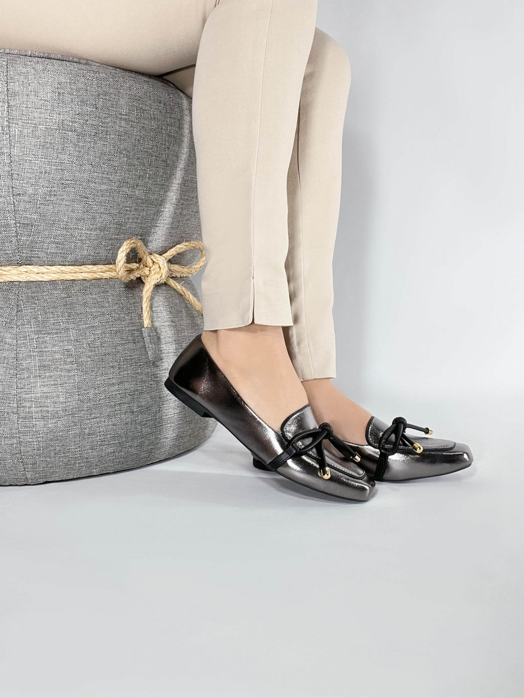 Material: Napa Prata Velho e Napa Preto;Enfeite: Laço em Nó na cor Napa Preto com ponteira ABS na cor Dourado;Palmilha: 4 mm de Espessura, Espuma em EVA, Revestida em Napa Preto;Solado em PVC Flexível com antiderrapante e na cor Preto.