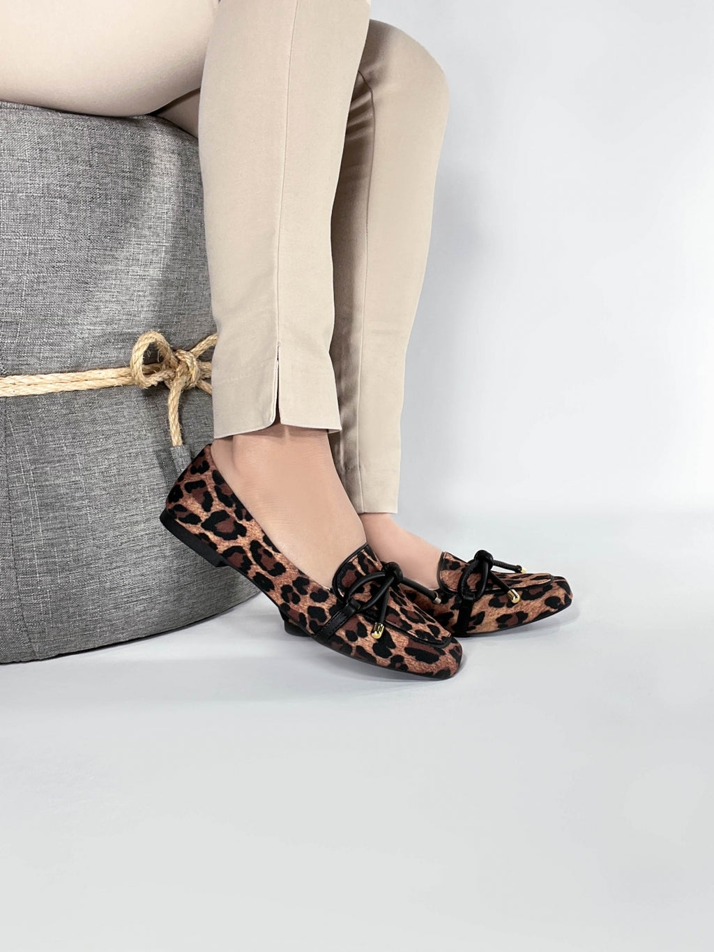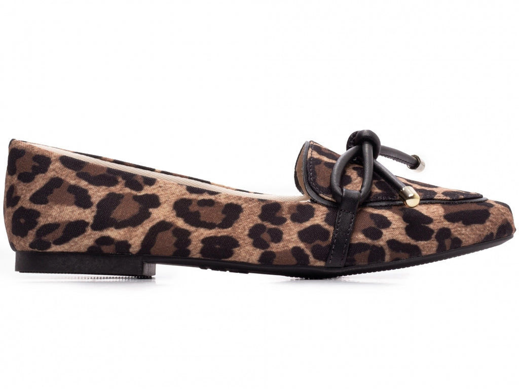Material: Tecido Onça e Napa Preto;Enfeite: Laço em Nó na cor Napa Preto com ponteira ABS na cor Dourado;Palmilha: 4 mm de Espessura, Espuma em EVA, Revestida em Napa Preto;Solado em PVC Flexível com antiderrapante e na cor Preto.