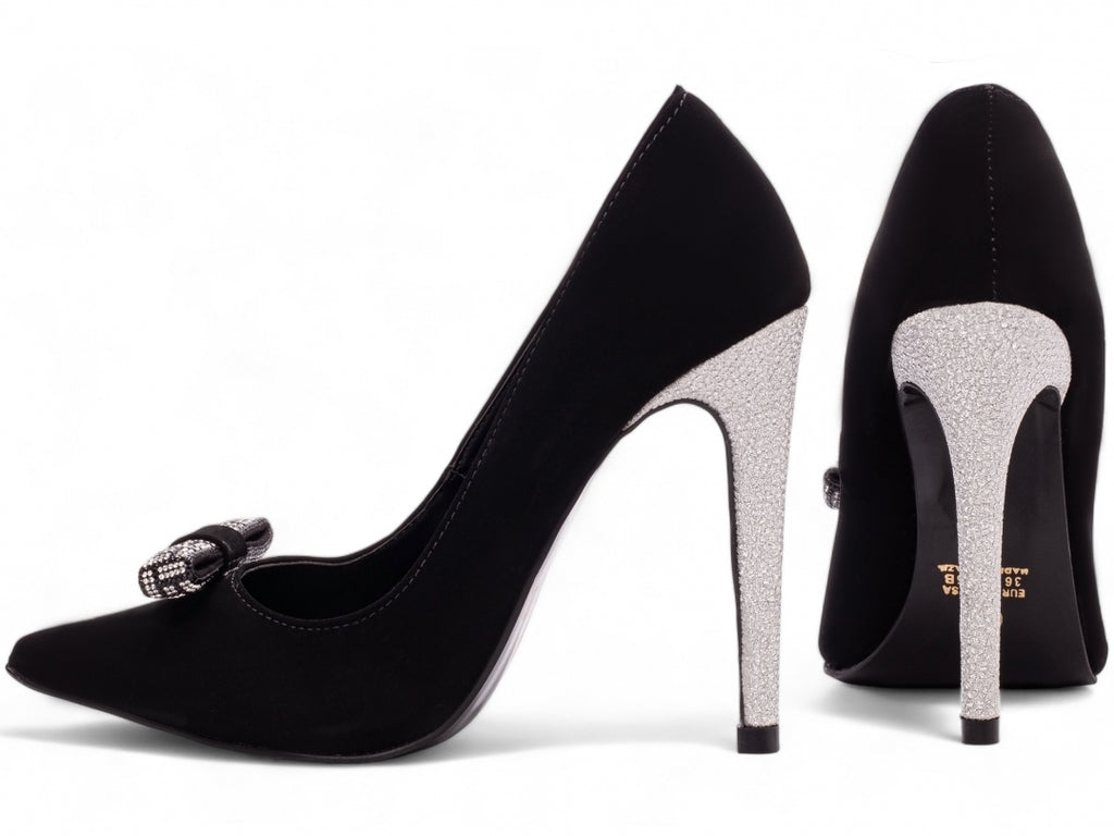 Scarpin luxo - Laço de Strass - Nobuck - Salto alto, fino metalizado 12 cm/Feminino